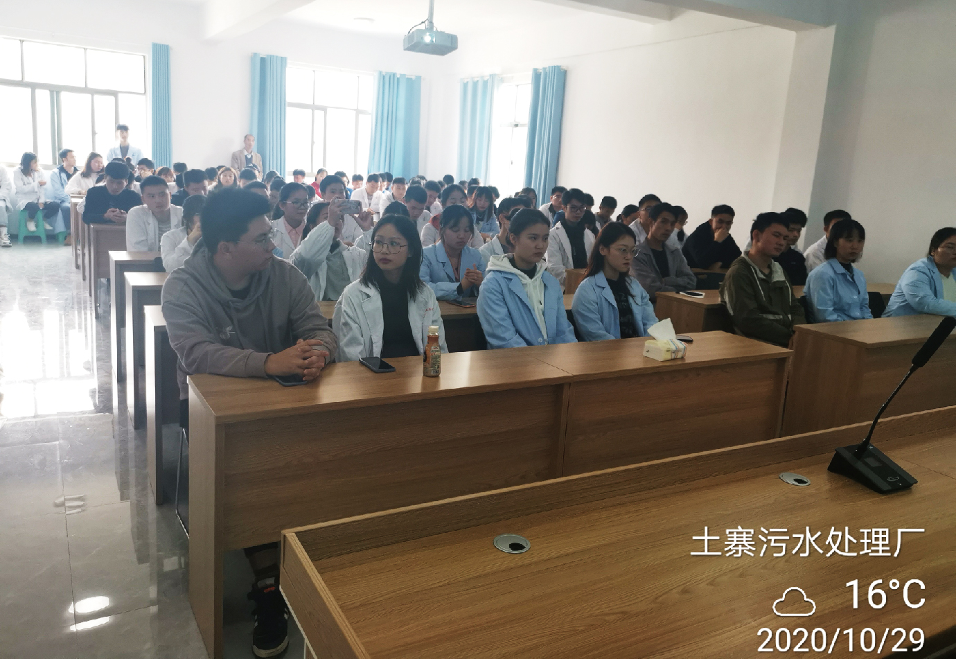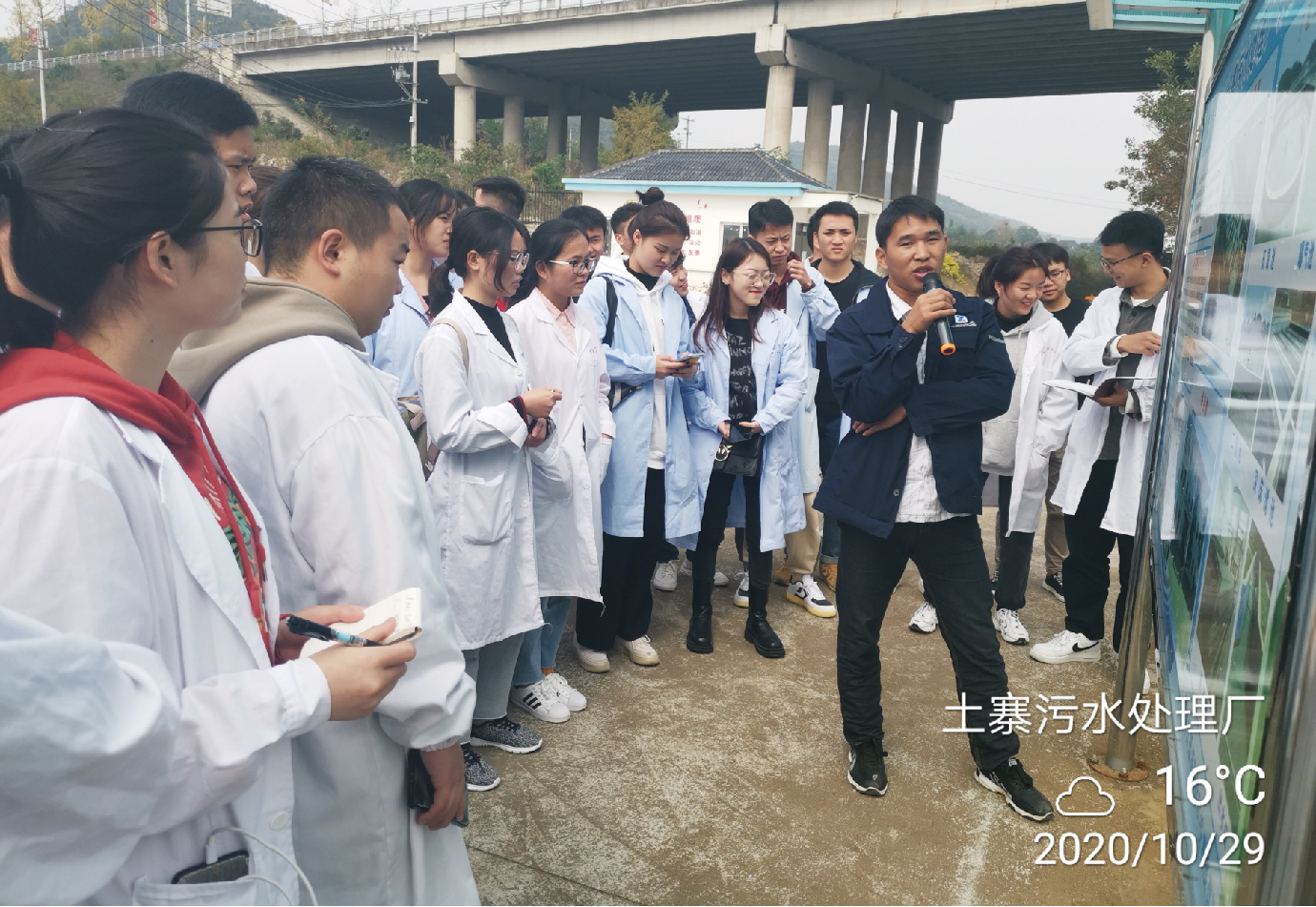 下午全体师生来到了播州区土寨污水处理厂,参观了整个污水处理厂现场,由土寨污水处理厂负责人带领大家讲解了整个污水处理厂工艺流程。从细格栅到AAO生化池、二沉池、深床滤池、次氯酸钠消毒池、污泥脱水间、板框式压泥系统等。