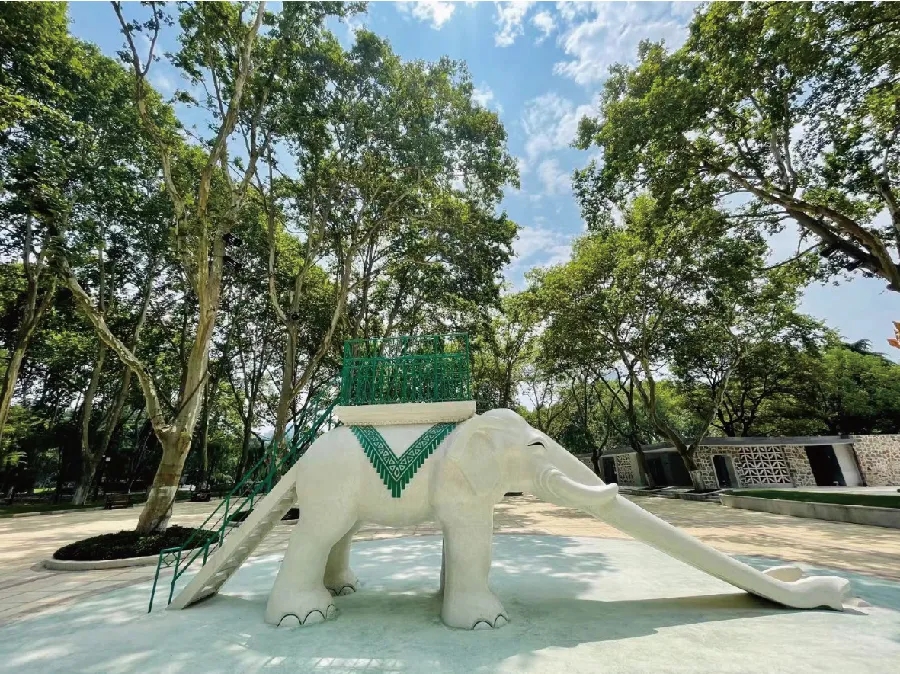 体验过了“威震江东”的厚重沧桑,远远地就能望见合肥人记忆中挥之不去的大象滑滑梯,仍静立原处。只是经过精细打磨,还原了大象洁白光滑的本色。或许很多玩过大象滑滑梯的市民都想不到,原来大象滑滑梯不仅可爱而且非常美丽。据逍遥津公园管理处负责人介绍,以前由于技术资金问题,磨损后只是进行简单刷漆,粗略修补,这个1979年用水磨石材质建造的滑滑梯,经过岁月的洗涤,褪去了原本的光泽,早已显得斑驳。本次改造,邀请了苏州古建园林工匠除去大象滑滑梯身上斑驳的油漆,按照传统的工艺精细打磨修复,还原本色,神彩翊翊。