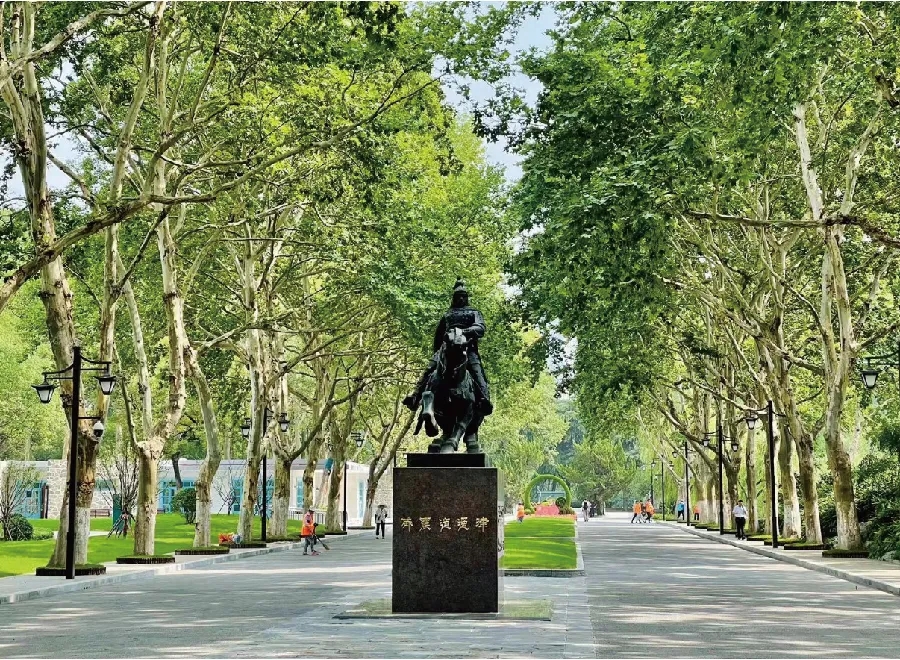 从“逍遥古津”入园,一条青石铺就的大道映入眼帘,193米的中轴全部采用了皖南老青石铺设,显得古朴厚重。两旁古树林立,中间张辽横刀策马的雕像,仿佛于千年之前疾驰穿越而来。本次改造以公园大门框景为标准,对张辽像基座进行抬高,并按原来位置北移5米,整体视觉效果更好。过去简陋陈旧的混凝土座基,换成了红棕色的整石,与张辽雕像的恢弘气象相称。基座背面首次雕刻了张辽的生平事迹。